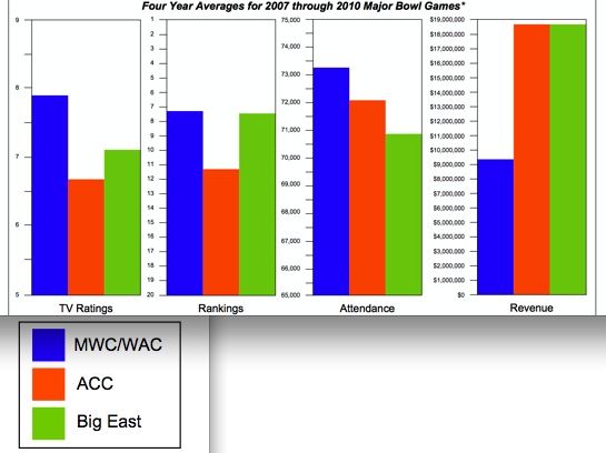 The Mountain West is a good conference. But I don't think it merits BCS status because the bottom of the conference skews from average to very, very bad. The drop off between the top three schools of BYU, Utah and TCU and the rest of the conference is monumental. To argue that the Mountain West is better than the Big East is just wrong. The numbers bear that out as well. If you go back and look at the schedules for the teams in both conferences and compare the records for all schools against teams from BCS conferences the Big East is much, much better. The Big East has gone 42-34 the Mountain West has gone 30-35. Six of the eight teams in the Big East have .500 or better records against BCS competition over the last four years. The only schools that don't aren't Syracuse, not very surprising, and UC, very surprising. In the Mountain West only BYU, Utah and TCU have winning records. That is not a shock, I think that those three programs are among the best in the country and are BCS quality without a shadow of doubt in my mind. However the rest of the conference is laughably bad. Through the last four years Air Force, Colorado State, New Mexico, San Diego State, UNLV and Wyoming have posted a combined 9-25 record against BCS conference schools. Only UNLV has managed to win two regular season games against BCS teams in the same season, they did it in 2008. The teams they beat that year? 5-7 Arizona State and 2-10 Iowa State. Of the other six Mountain West schools, none of them have won more than two games against BCS opponents in the last four years. On the field from the top to bottom the Mountain West is not a BCS caliber conference. Doc Saturday has a handy graph drawn up by the people at Arent Fox.