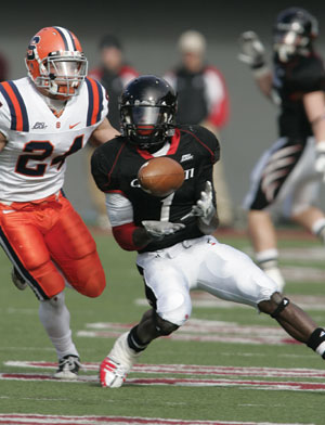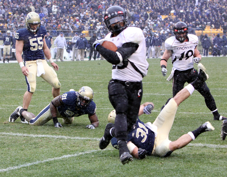 I like the current UC uniforms. The White, Black and Red looks all work for me. Even the alternate versions of the basic looks, with the white pants, aren't exactly terrible. so persistent rumors and Butch Jones's comments about uni tweaks coming for later in the year made me a touch reticent, especially considering that the changes he made to Central Michigan's uniforms wound up looking terrible. But the tweaked uniforms will be making their debut on Friday night with the Away Whites, (the Black's will have to wait until the Syracuse game, USF is the Ring of Red). And I like them, they keep the current look in tact while dispensing with the three elements I most dislike, the red shoulder pad stripping that went no where, the random bit of black under the arms of the white and red shirts, and the Bearcat Eyes motif which looks great on a T-Shirt, but terrible on a Jersey. The new jerseys look modern, but with the piping on the shoulders and the TV numbers have an old school look about them. All in all an improvement upon an already good look.