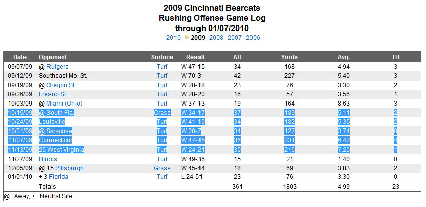 So the change in personal groupings for the month long run with Zach Collaros was nothing more than window dressing. It looked like the Bearcats were going to grind it out on the ground a little bit more then they had for the bulk of the season. UC did run it more, but the offense was still one that was going to stretch defenses vertically with the passing game. The main difference was that Collaros used much, much more play action to open up the vertical seams then Tony Pike did, but that was about it.