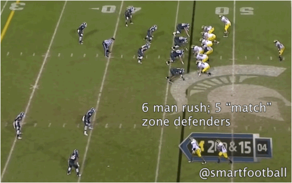 Temple doesn't run their six man zone pressure exactly the same way that Michigan State does. For one thing the terminology is different and their rules and landmarks for their defenders are almost certainly different. Narduzzi and Dantonio are very open in discussing their base quarters coverage scheme in clinics and meetings with other staffs, but their zone blitzes are strictly off limits. Even without the guidance or help from the Michigan State staff Temple has figured out a way to make it work for them.